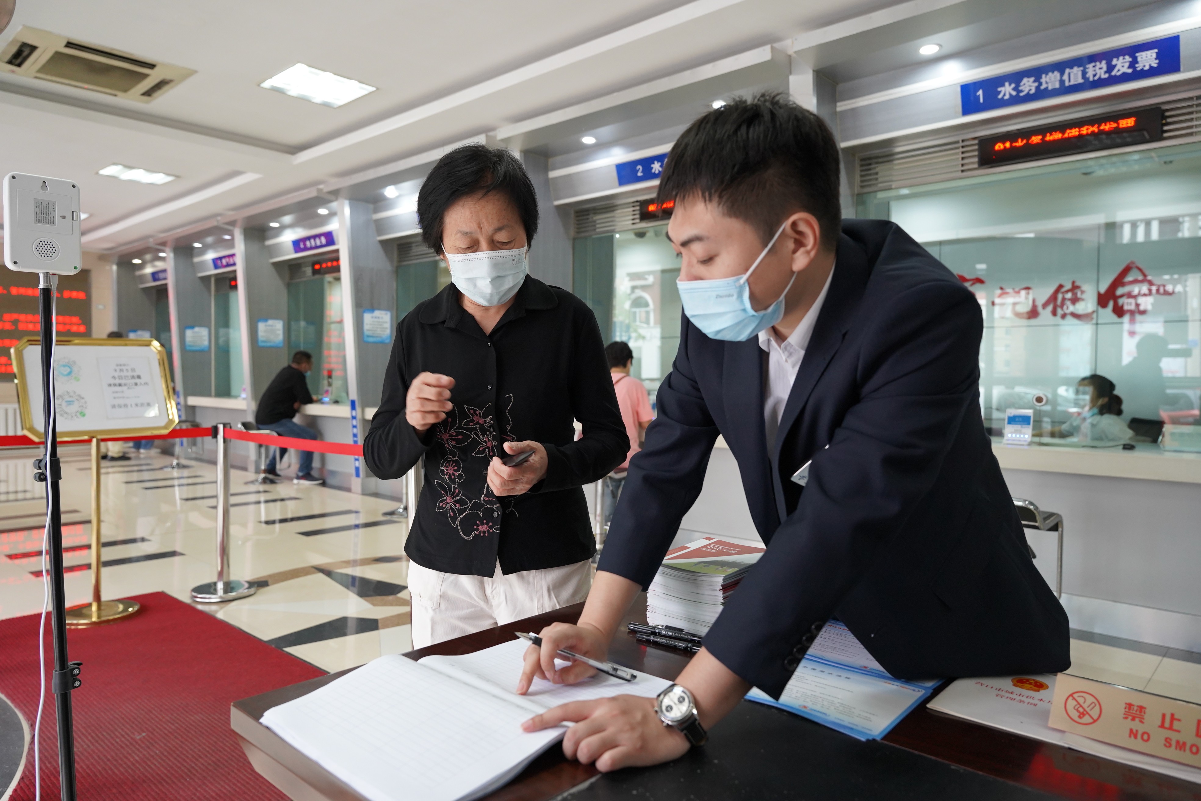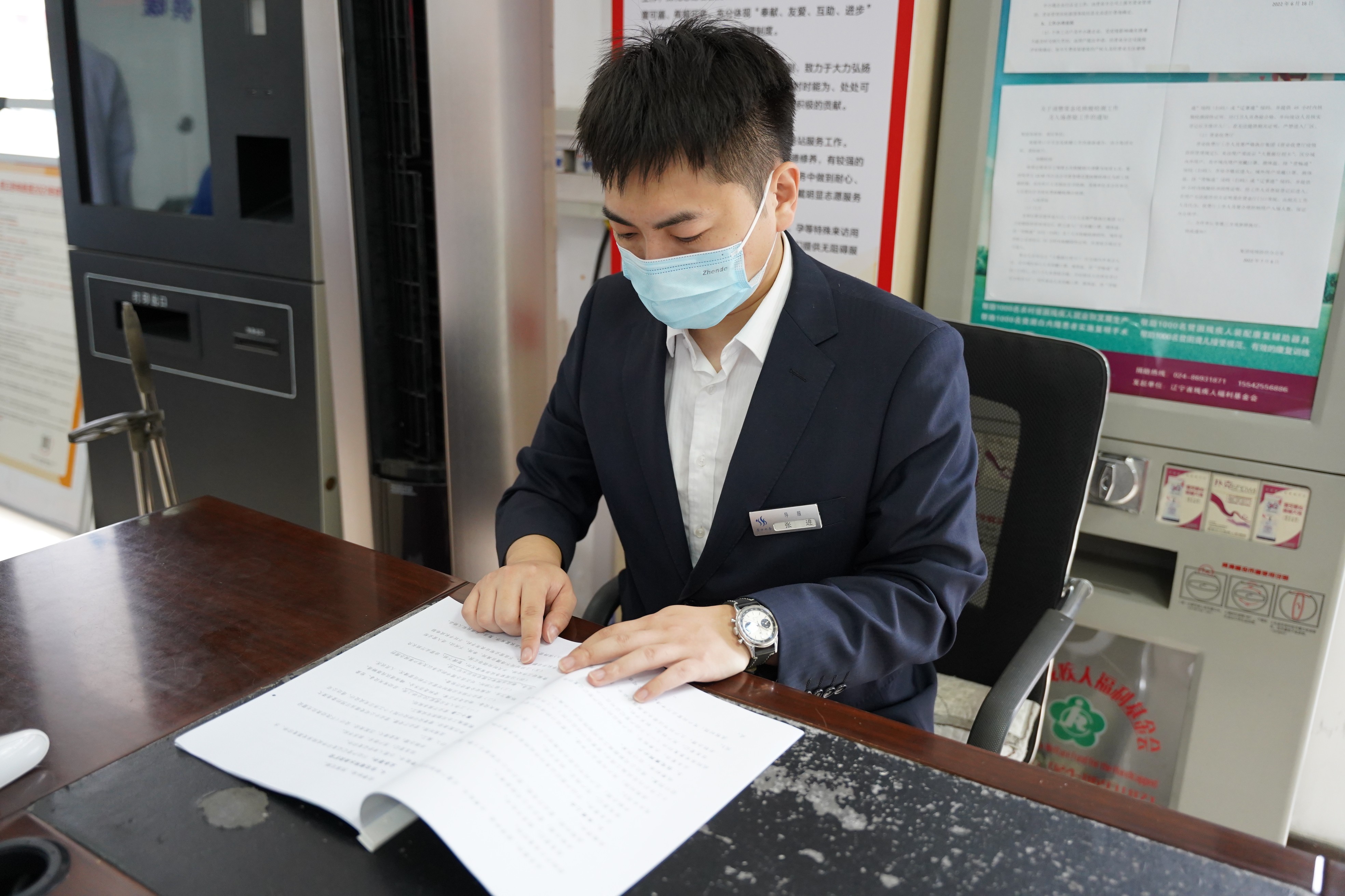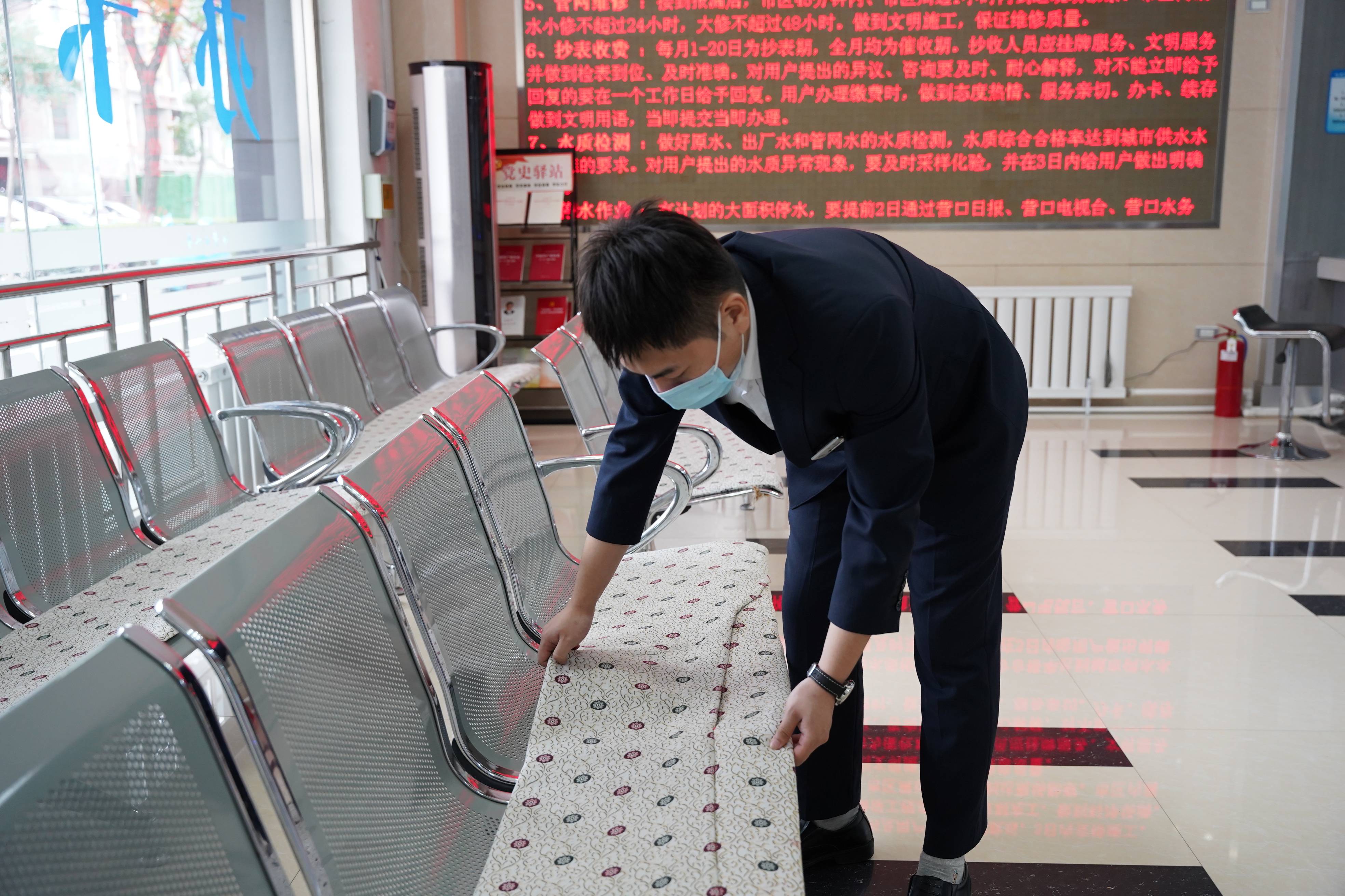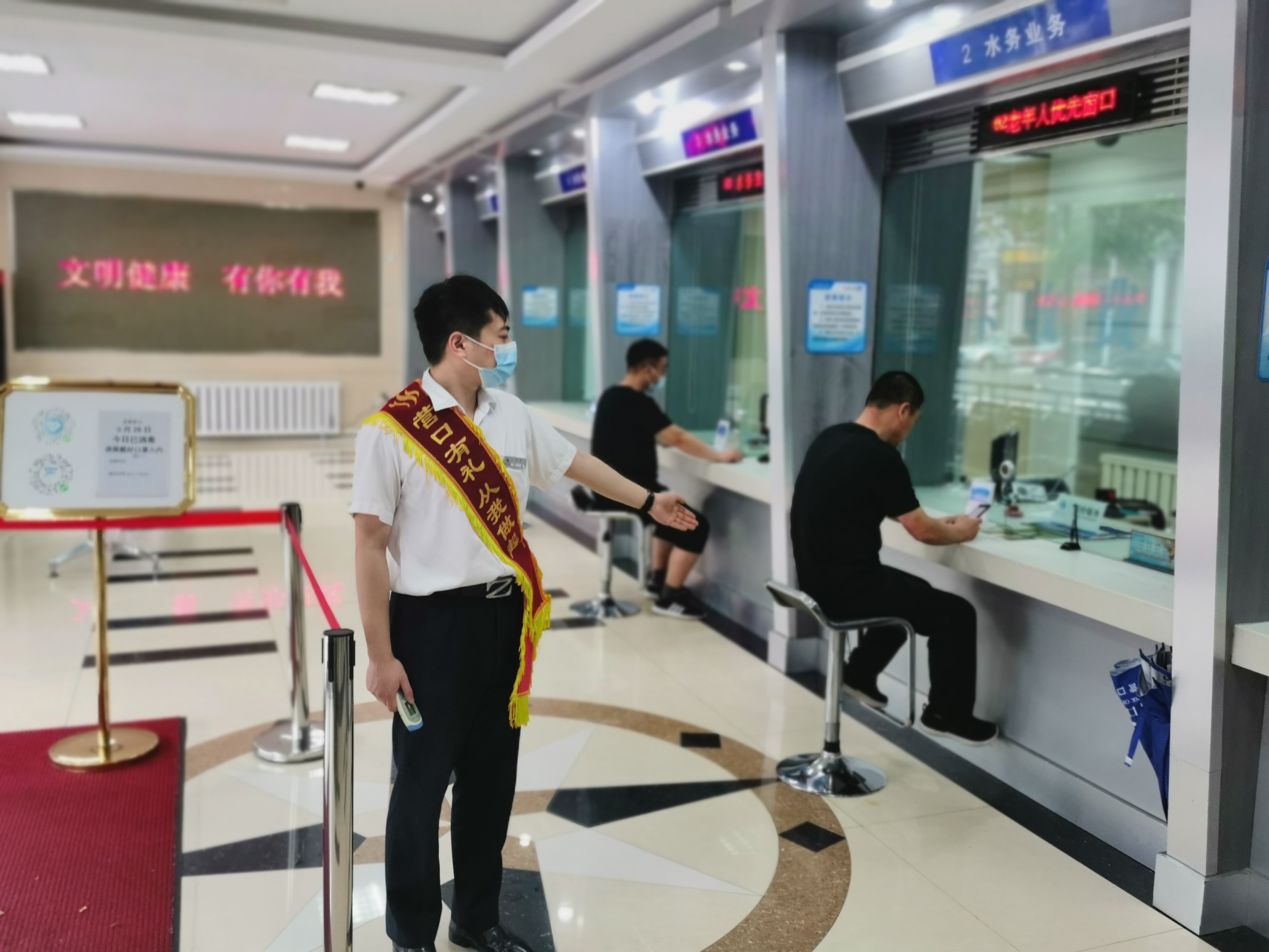 他發(fā)現(xiàn)來訪用戶總是忘戴口罩,其中以老年用戶居多。為了兼顧防控工作和廳內業(yè)務的正常開展,他采取了靈活辦公方式。先請老年用戶在門口的一米線外等候,由他為用戶代繳水、燃氣、公交費和代為查詢。其中有一位大爺,腿腳不便拄著拐,忘記水費單號,十分焦急,他耐心詢問大爺?shù)男彰偷刂?,在抄表員的協(xié)助下,對照大爺身份證上的地址,查詢到水費信息并完成了交費。大爺?shù)淖优篮螅騺黼娫拰堖M及工作人員表示感謝。