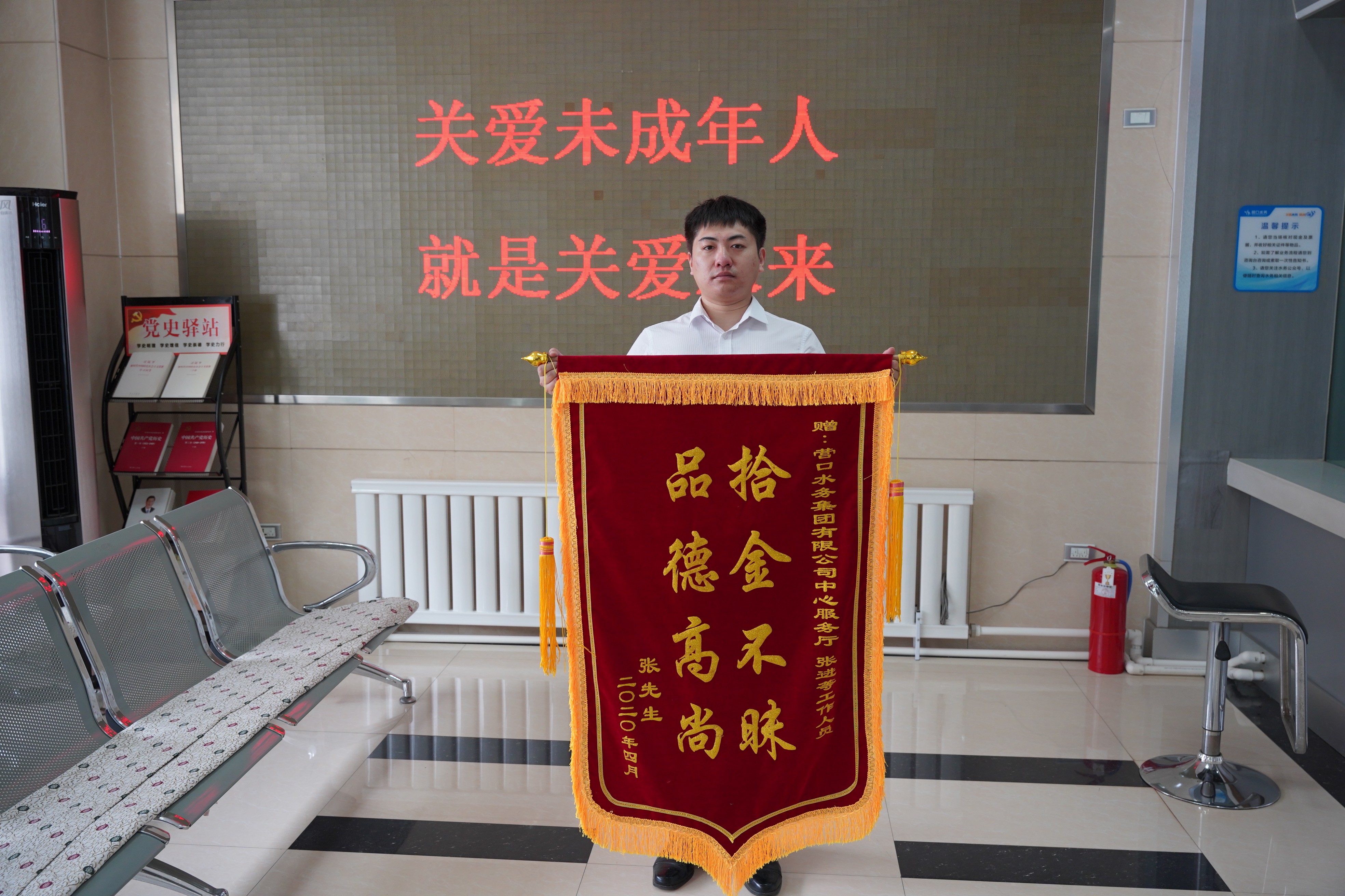 2020年4月,用戶張先生來到大廳辦理業(yè)務,辦理結束后匆忙離廳時不小心將錢包遺落在廳內的窗口柜臺。他發(fā)現(xiàn)后,馬上將撿到的身份證與疫情來訪用戶登記本進行核對,找到張先生的電話號碼,立刻與該用戶取得聯(lián)系,張先生返回后現(xiàn)場點驗,包內大額現(xiàn)金、銀行卡及各類證件均保存完好,用戶十分感動,對他及廳內的工作人員表示感謝后,并贈送給中心服務廳張進錦旗一面。